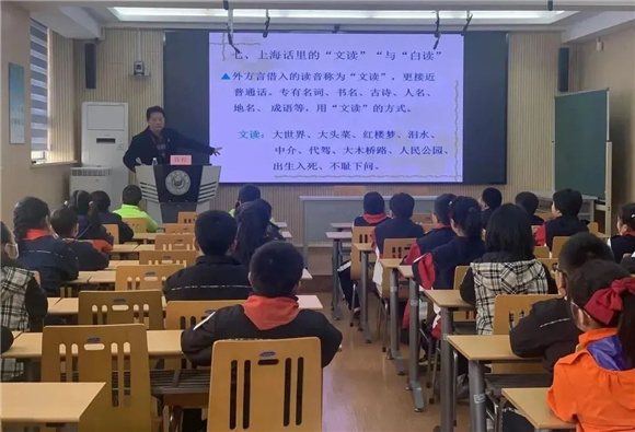 钱程还把他的沪语学堂带进了学校,给同学们上了与众不同的“开学第一课”。用生动形象的表演语言点亮了同学们课堂。从白读、文读的区别,到尖音、团音怎么分辨,再细化到“红楼梦”该怎么念,“大世界”如何发音,钱程把滑稽模仿带进课堂,使孩子们在喜笑颜开之际增长了知识。
