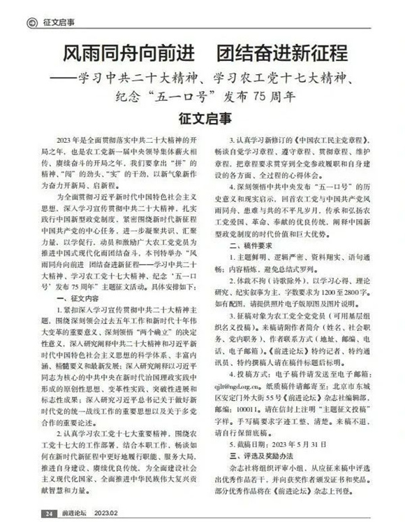1948年4月30日,中共中央发布纪念五一劳动节口号,并迅速得到各民主党派、无党派人士和社会各界普遍而热烈的响应,开启了中国共产党领导人民、团结各民主党派和社会各界人士协商建国的辉煌历程。今年是中共中央发布“五一口号”75周年,《前进论坛》杂志社推出“学习中共二十大精神、学习农工党十七大精神、纪念‘五一口号’发布75周年”主题征文活动。回首多党合作一路行来经历的风风雨雨,才更有“风雨同舟向前进、团结奋进新征程”的亲历感、画面感。